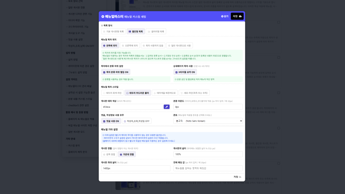 매뉴얼마스터 관리 패널을 통하여 게시판 커스텀 세팅이 가능합니다.
