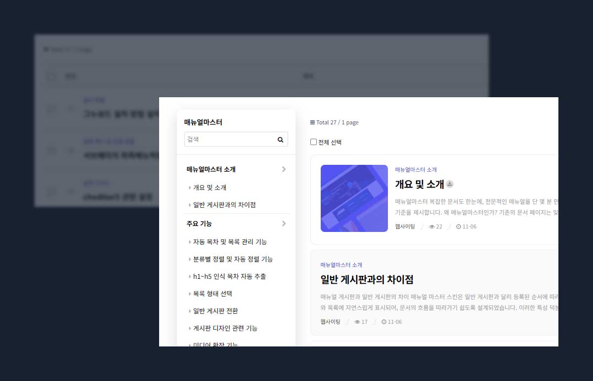 매뉴얼 마스터 스킨은 일반 게시판과 달리 등록된 순서에 따라 오름차순으로 정렬되는 구조를 기본으로 합니다.