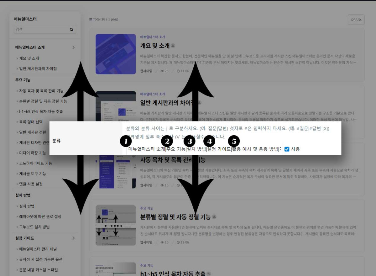 게시판에서 분류를 사용한다면 분류에 입력된 순서대로 목록 및 목차에 노출